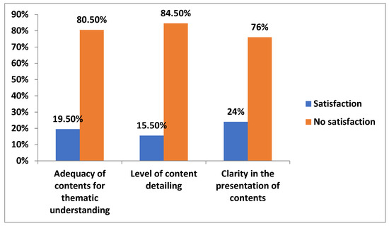 A high percentage of students showed negative satisfaction with the curricular aspects, with the aspects related to the level of content detail presenting the worst results (84.50%), followed by the adequacy of content for thematic understanding (80.50%) and clarity in the presentation of content (76%) (Figure 2).