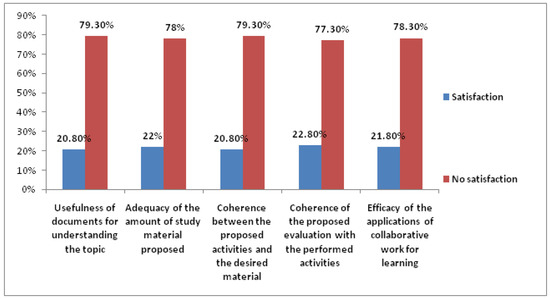 In the analysis of the relationship of student satisfaction with the didactic proposal and age, there were no statistically significant differences (Student’s t-test: 0.080 (p = 0.936 in usefulness of documents for understanding the topic); −1.001 (p = 0.318 in adequacy of the amount of study material proposed); 0.291 (p = 0.771 in coherence between the proposed activities and desired material); −0.905 (p = 0.366 in coherence of the proposed evaluation with the performed activities); 1.447 (p = 0.149 in efficacy of the applications of collaborative work for learning); at a 95% confidence level).