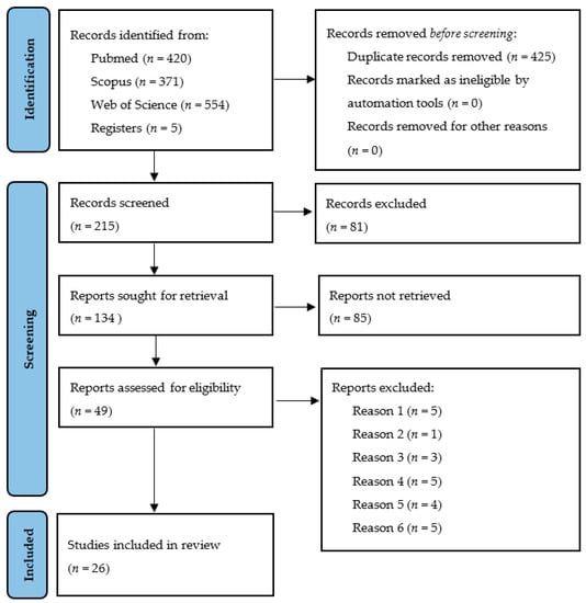 The initial electronic search identified 425 articles after removing the duplicates. On the basis of the title alone, 215 articles were selected, of which 49 were selected on the basis of the abstract. After reading the full text, 26 articles fulfilled the inclusion criteria (Figure 1).