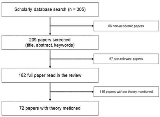 A search in September 2019 returned 305 papers. Preferred Reporting Items for Systematic Reviews and Meta-Analyses (PRISMA) (Figure 1) was used to filter these papers [43]. After scrutinising the title, abstract, and keywords, 182 academic papers on age-friendly communities were left. Finally, after reading all these 182 papers, 72 papers were found containing some explicit theories. Most of these 72 studies were conducted in the Global North, including Canada, the United States, and European countries. Two criteria for literature selection were adapted in the final stage. The first criterion was to review those papers, introducing other new theories into age-friendly community studies. All the 182 academic papers can be regarded as containing some theories because age-friendliness is a theoretical concept itself. Another two theoretical concepts, active ageing and age-in-place, also appear frequently in these 182 academic papers. However, many innovative frameworks were developed by using other theories, rather than only age-friendly, active ageing and age-in-place. Thus, age-friendly, active ageing, and age-in-place were only regarded as the common terms to show the research topic rather than specific theories in this study. The second selection criterion was that the papers should use the theories in their discussion section.