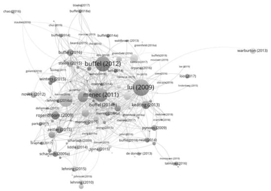 Using VOSviewer, the citation map gave more information about the theoretical development trend of age-friendly community studies. As illustrated by the visualised citation map (Figure 4), among the 182 papers, Lui et al.’s [30] literature review remains the most influential. The second most influential publication is Buffel et al.’s [74] work belonging to the production of a space group. The third most influential is Menec et al.’s [42] paper with an ecological perspective. The citation map was clustered into 18 groups by the publication cluster function of VOSviewer. However, some groups only contain a minimal number of publications. Thus, this study focused on clusters with more than 10 papers, and seven larger clusters were identified and further analysed. According to the aforementioned definition of the central publication, seven central publications were identified from the analysed clusters. Table 4 shows the details of these seven publication groups. Among these seven central publications, five of them are theoretical publications. The social capital theory was used in the central publication of Cluster One, which is the largest cluster. The central publications of Clusters Three and Five are from the ecological theory group. The central publications of Clusters Four and Seven are from the production of space group. Again, the citation map produced by VOSviewer shows that ecological theory, the production of space, and social-related theories, which are the three types of influential theories in age-friendly community studies.