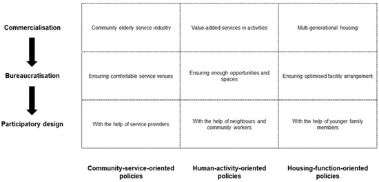 Community-service-oriented policies regulate essential services for older people in communities. To commodify age-friendly communities, this type of policy can encourage service providers to conduct business in communities. This measure can promote the elderly service industry within communities and trigger regional economic activities. Thus, older residents can be regarded as “real” customers and be considered more in community building. By bureaucratising community services, service providers can have convenient access to suitable venues for elderly services in communities. Although communities usually tend to leave enough space for daily services, the physical conditions of these venues may not satisfy the requirements of the services for older people [143]. With bureaucratisation, service providers can coordinate with community designers to ensure the spaces are comfortable for older residents to access and stay. Lastly, community services can expand the social support network of older residents. Older residents can have sufficient contact with service providers, and their spatial demands can also be expressed with the help of the service providers.