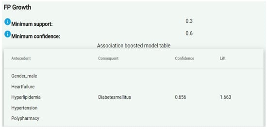 Once association rules were generated, they were sent to the PPDDM Manager. Similar to the process in the first step, the PPDDM Manager combined the association rules retrieved from all the participating agents, calculated the global confidence values, and eliminated the ones having a confidence lower than the minimum value allowed, which was 0.8 by default. As a result, the remaining association rules constituted the frequent patterns discovered in the datasets. The FAIR4Health Platform presented the association rules in an “Antecedent ≥ Consequent” format, as shown in Figure 1.