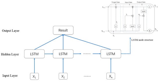 where denotes the input data; denotes the forget gate; denotes the input gate; denotes the output gate; denotes the output data; denotes the state of the cell; denotes the temporary state of the cell; denotes the weight of the forget gate; denotes the weight of the output gate; denotes the weight of the input gate; denotes the weight of the temporary state; denotes the bias of the forget gate; denotes the bias of the input gate; denotes the bias of the output gate; denotes the bias of the temporary state; denotes the sigmoid function; tanh denotes the tanh function; [] denotes the connection between two vectors; and denotes the matrix product. Figure 1 shows the LSTM architecture.