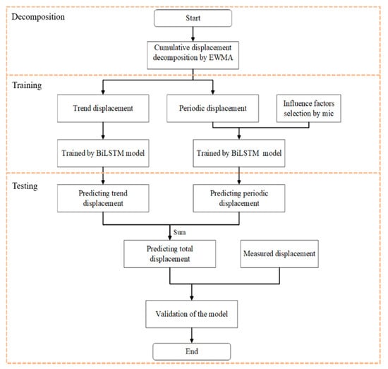 Figure 3 shows the complete implementation process of the model proposed in this paper. Step 1: considering the characteristics of time series data, the EWMA method is applied to decompose the historical landslide displacement, and trend and periodic displacement components are obtained based on the historical displacement data. Step 2: the BiLSTM model is trained according to the historical trend displacement data, and the subsequent trend displacement is predicted. Step 3: the MIC is considered to calculate factors that may be intrinsically related to historical periodic displacement, and factors with a higher correlation are selected as input items of the BiLSTM model. Step 4: according to historical periodic displacement data and the selected influencing factors, the BiLSTM mixed prediction model is trained to predict subsequent periodic displacements. Step 5: the predicted cumulative displacement is obtained by adding the displacement results obtained in Steps 2 and 4 at the same time point. Step 6: the predicted cumulative displacement is compared to the actual cumulative displacement obtained via monitoring, and the predicted results are evaluated with evaluation indices.