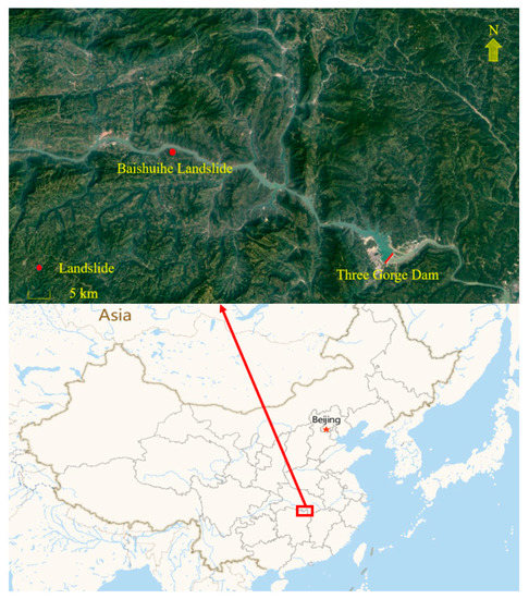 Geographical location of the Baishuihe landslide in the Three Gorges Reservoir area.