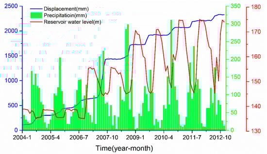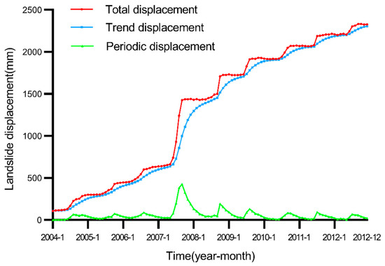 Landslide periodic displacement differs from trend displacement, which is mainly influenced by external factors, while the rainfall and reservoir water levels in the Three Gorges area periodically fluctuate every year. Figure 6 shows that from April to August each year, when the rainfall sharply increases and the reservoir water level declines, the slope body becomes active, and the slope body increases the resultant landslide displacement. Conversely, landslides deform slowly at a constant rate. Therefore, it can be inferred that rainfall and the reservoir water level are closely related to landslide displacement [6,19]. During the rainy season, rainfall in the Baishuihe landslide area increases rapidly, and landslide displacement increases with a slight lag with increasing rainfall. In the rainy season, the landslide displacement range is 30–70 mm every month, and in the dry season, the range is 0–5 mm every month.