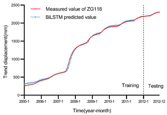 Because landslide trend displacement is less affected by external factors and mainly influenced by internal factors, landslide displacement can feed back the current landslide state to a certain extent [16,30]. This paper intends to introduce trend displacement data one and two months before the landslide occurrence as the BiLSTM model input sequence into the training model to predict future trend displacements. A total of 108 months of Baishuihe landslide data was selected for the landslide trend displacement simulation experiment. The trend displacement data over the first 96 months were selected as the training set of the BiLSTM model, and the trend displacement data over the following 12 months were selected as the test set to verify the prediction performance of the BiLSTM model. Figure 8 shows that at the early stage of model training, the model fitting effect is not particularly good, and there occurs a certain deviation from the trend of the actual displacement, but with an increasing amount of data, the model fitting degree gradually increases. After 96 training data points, the prediction model trained on the test set clearly indicates that the BiLSTM model can effectively predict the trend displacement component of the Baishuihe landslide.