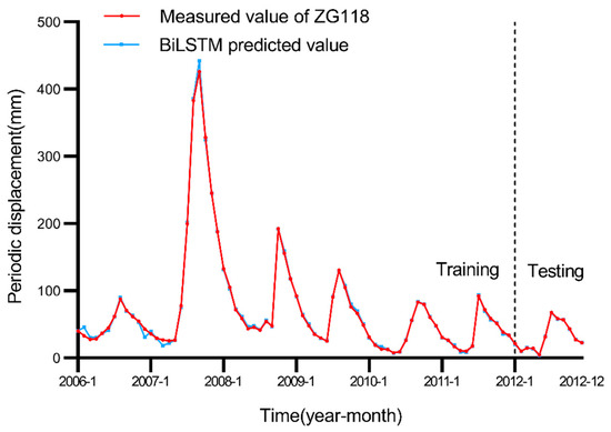 In this paper, the first 96 months of periodic displacement data of the Baishuihe landslide are selected as the training set of the model, and the subsequent 12 months of periodic displacement data are selected as the test set. In addition, the MIC method is applied to calculate the correlation between the influencing factors and periodic displacement of the Baishuihe landslide. The factors with a higher correlation are selected as the input sequence of the BiLSTM model, and the output sequence of the BiLSTM model comprises the predicted periodic displacement. The predicted results are shown in Figure 9, and it can be observed that the BiLSTM model can accurately predict the periodic displacement of the Baishuihe landslide.