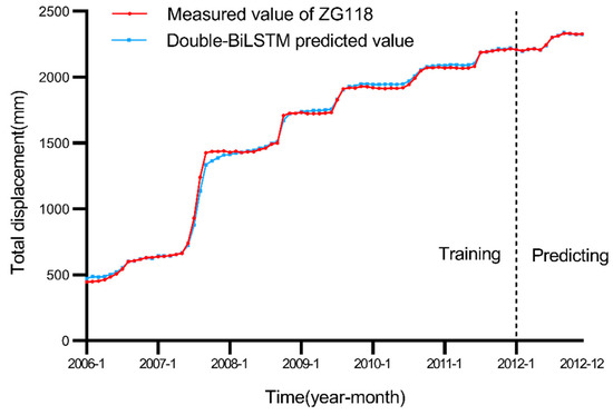 After predicting the trend and periodic displacement components of the Baishuihe landslide over the last 12 months, according to the EWMA-based landslide displacement decomposition principle (Equation (2)) proposed in this paper, the model prediction process is completed by adding the trend and periodic displacement values corresponding to these 12 months, and the predicted landslide displacement is thus obtained. As shown in Figure 10, the predicted results with the Double-BiLSTM model fluctuated with the actual data at the early training stage. After 96 months of data training, the predicted results obtained with the Double-BiLSTM model were remarkably close to the actual displacement values in the following 12 months.