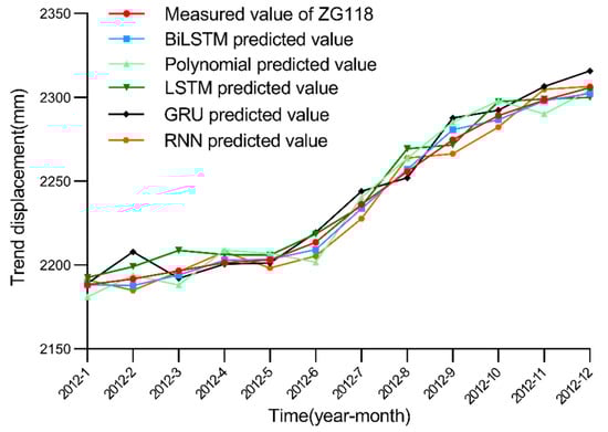 Because trend displacement is mainly affected by internal landslide factors, this paper directly applies the BiLSTM model to simulate and predict trend displacement. Compared to the traditional polynomial model 16,32], the BiLSTM model suitably processes time series data, can effectively record input data information and can steadily improve the model performance with increasing training data. After many experimental model training iterations, the number of nodes in the hidden layer of the BiLSTM model was set to 100, and the learning rate was set to 0.01. The parameters of the polynomial model in this paper are based on previous research [16,32], and the highest power is set to 3. A comparison of the trend displacement values predicted with the BiLSTM and other four models is shown in Figure 12.