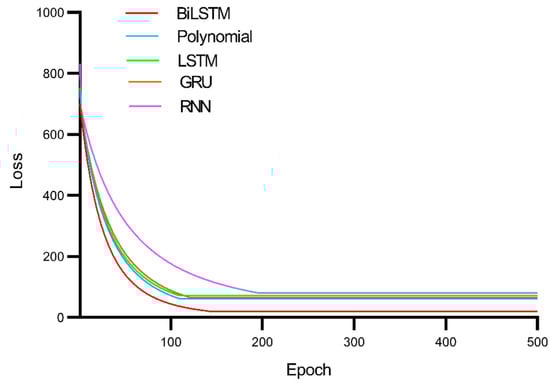 Figure 12 reveals that the BiLSTM model is obviously superior to the other four models in landslide trend displacement prediction. Because landslide trend displacement also comprises typical time series data, the polynomial model simply treats trend displacement as ordinary data. RNN, LSTM and GRU also cannot process time series data as suitably as can the BiLSTM model. Figure 13 shows the convergence of these models.