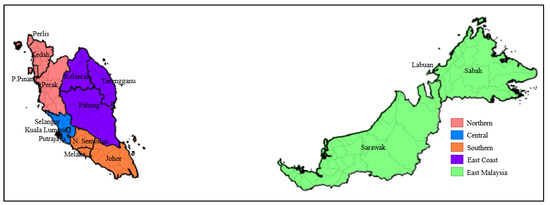 Between 22 January and 4 February 2021, a nationwide ecological-correlation study was conducted in Malaysia, involving 51,476 active COVID-19 cases spread across 144 districts in 13 states, 3 Federal Territories, and 5 regions (Northern, Central, East Coast, Southern, and East Malaysia) (Figure 1).