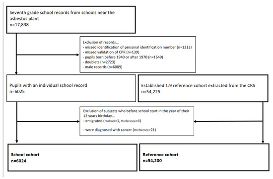 The construction of the Aalborg school cohort was described in detail previously [6]. In brief, from the Aalborg City Archives, we retrieved 7th grade school records on former pupils born between 1940 and 1970 who attended a school located 100 to 750 m from the asbestos cement plant in Aalborg, Denmark. Since 2 April 1968, all residents in Denmark were assigned a unique 10-digit personal identification number (CPR number) from the Danish Civil Registration System (CRS). The CPR number was used to identify the former pupils and to sample a reference cohort that was frequency-matched 1:9 in sex and five-year birth year intervals. Construction of the cohorts and exclusion of subjects are shown in Figure 1.