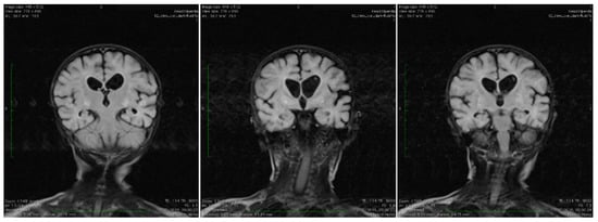 Coronal T2 TIRM dark fluid MRI sequences revealing bilateral basal ganglia hyperintensities and cerebral atrophy.