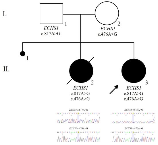 For genetic analysis, blood samples were collected. Two pathogenic variants in the ECHS1 gene, one of the genes associated with the mitochondrial disorder (gene panel version DG-2.8) were detected. The index case was compound heterozygous for the c.476A>G (p.Gln159Arg; rs375032130) and c.817A>G (p.Lys273Glu; rs565090080) variants in the ECHS1 gene, which are pathogenic according to VarSome [16].
