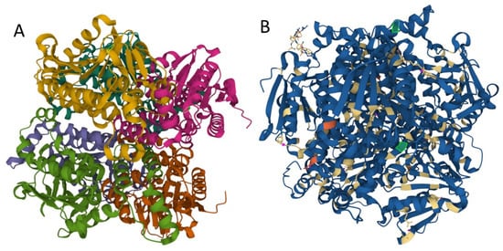 Structure of human enoyl-coenzyme A (CoA) hydratase short chain 1, encoded by ECHS1 gene. (A) the crystal structure at a resolution of 2.55 Å, from the PDB protein databank, structure 2HW5 [18]. (B) Missense mutations affect the homohexameric ECHS1 structure. (the location of the changes are represented with green in 2HW5, and were visualized by using Mol * Viewer, a modern web app for 3D visualization and analysis) [19].