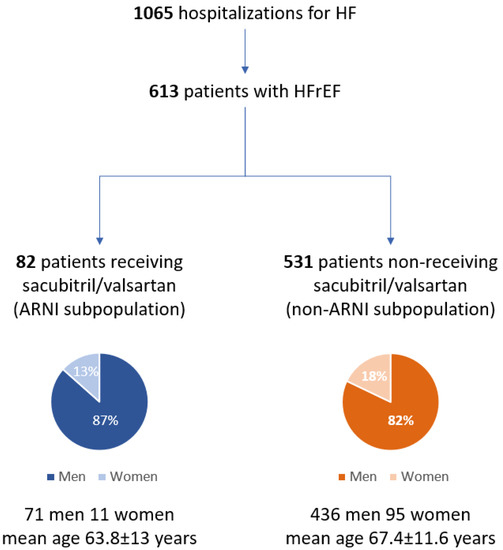 The study population consisted of 613 patients with HFrEF (507M, mean age 67.1 ± 11.7 years) among whom two subpopulations were distinguished: ARNI subpopulation (13.4%, 71 men, mean age 63.8 ± 13 years) and non-ARNI subpopulation (82.6%, 436 men, mean age 67.7 ± 11.4 years) (Figure 1).