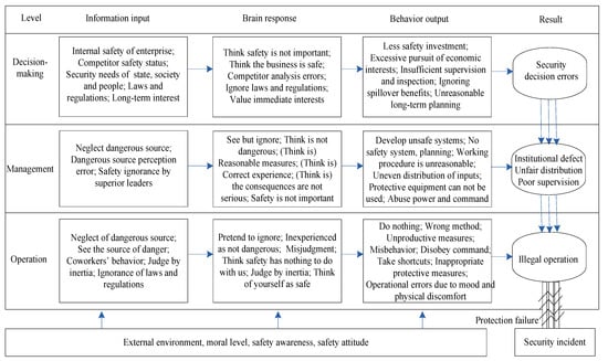 The performance of the decision-making level is the core of an enterprise’s safety production, playing an exemplary and guiding role for the management and the operation level, being responsible for the top-level design of the enterprise’s safety production and determining the input of the safety production. The performances of the decision-making, management, and operation levels are interrelated, which may eventually lead to the occurrence of security incidents. The formation mechanisms of improper performance at each level and their effects are shown in Figure 1.