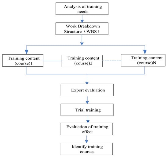 In order to make the content of safety training coincide with the different needs of construction enterprises and improve the pertinence of the training content, first of all, it is necessary to decompose and refine the training needs, and a work breakdown structure (WBS) can be used to clarify the needs of the target of the tree-layered decomposition to obtain the preliminary plan of safety training content. Secondly, it is useful to evaluate and adjust the preliminary plan by using the expert investigation method; thirdly, it is important to conduct trial training; fourthly, it is useful to evaluate and summarize the training’s effect in time, so as to further adjust the training content. This flow is shown in Figure 2.