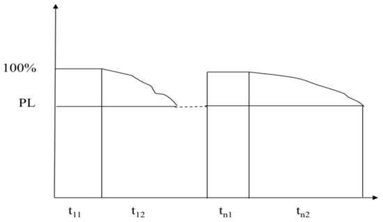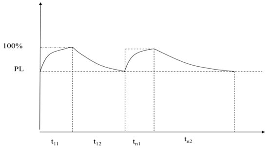 Figure 3 shows that is the duration of the continuation of the first () supervision, is the implementation rate of safety behaviors at the end of the supervision interval (from 100% down to ) and is the interval from the first supervision to the second () supervision. It can be seen from practical experience that after the first () time of the () time supervision, the time of becomes longer and longer, that is, the implementation rate of safety behavior declines slowly and approaches 100% indefinitely, and the supervision interval is extended indefinitely, so as to achieve the purpose of simple safety behavior training, that is, the cultivation of simple, safe behavioral habits. Here, the purpose is to study how many times after supervision can develop simple, safe behavioral habits and how long the time of each supervision is.
