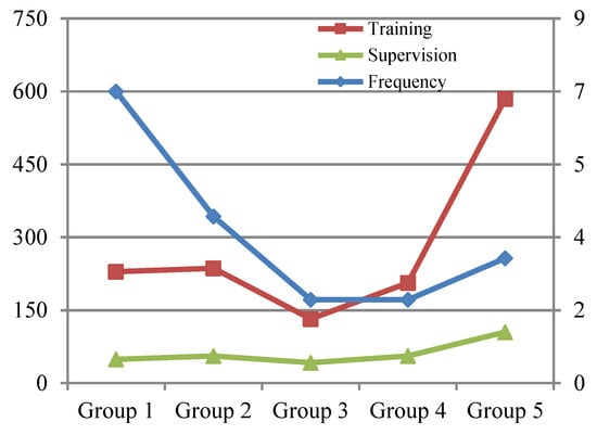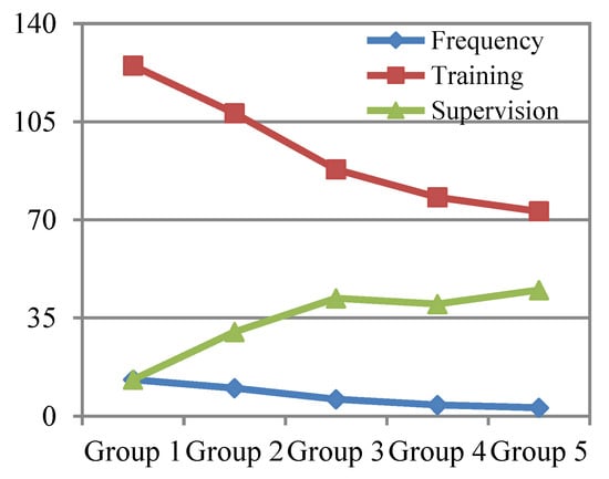 From the above five groups of experimental data, it can be seen that the third group had the lowest training time and training cost, that is, days and months, and the minimum training amount under the premise of meeting the requirements was two. Based on Figure 7 and Figure 8, the training cost of the fifth group was obviously higher than that of other groups, and the interval training of the fifth group was 8 months; therefore, although each training lasted longer (35 days), a long interval (August) likely caused the forgetfulness of the knowledge of the workers of complex safety behavior, so the complex safety behavior education training mechanism design should try to avoid the phenomenon of long training intervals. At the same time, in the case of short training intervals, such as days and months, it is not advisable to require frequent training due to the short duration of each training and the low level of mastery of complex safety behavior knowledge, thus increasing the training times and related training costs. In conclusion, the design of the complex safety behavior training mechanism should follow the principle that each training lasts a long time and the training interval should not be too short, so as to minimize the cost of safety education and training on the basis of ensuring the quality of safety education and training.