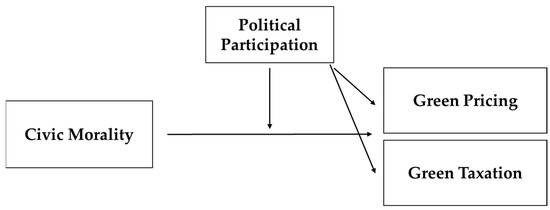 Rapidly developing climate change is turning into an all-out environmental crisis that is upending the lives and livelihoods of people worldwide [1]. Humankind has witnessed an unprecedented number of disasters, from uncontrollable wildfires to winter storms, in recent years [2,3]. The Intergovernmental Panel on Climate Change (IPCC) reported that there would be a 1.5 °C increase in temperature between 2030 and 2052, foretelling an ominous future for all countries worldwide; some countries would be uninhabitable, with people fleeing from them for a better climate due to sweltering weather and scarcity of water resources [4]. Given this context, mitigating and adapting to the impact of climate change is more urgent than ever before. In particular, such efforts require significant financial sacrifices from citizens. Thus, this study examines factors that may cause individuals to be willing to support increased taxation (green taxation) and pricing (green pricing) for environmental protection. While green taxation and green pricing may not solve the environmental crisis, they at least provide the government with financial resources to cope with it. Among the possible explanatory factors, this study explores civic morality and political participation and the interplay between the two in explaining green taxation and green pricing.