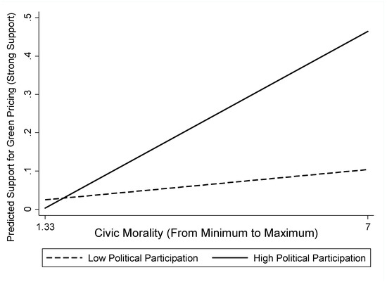 More importantly, in terms of joint effects (Step 2 of Model 1 and Model 2), the study focused on whether political participation moderated the relationship between individuals’ sense of civic morality and their support for green pricing, as well as the relationship between individuals’ sense of civic morality and their support for green taxation. The results confirmed the hypotheses that political participation functions as the moderator and helps strengthen the positive link between civic morality and green pricing and between civic morality and green taxation.