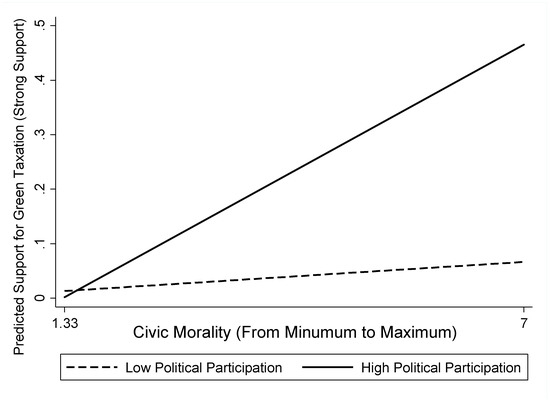 Political participation moderates the relationship between individuals’ perceptions of civic morality and their support for green taxation, such that the relationship becomes stronger as the level of participation increases.
