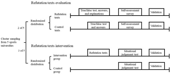 In this study, a cluster sampling method was used to recruit participants. A total of three hundred nine athletes were recruited from the five sports universities in China. There were one hundred thirty-two participants from two sports universities (47.73% female, mean age = 20.99 ± 2.11) who participated in evaluating the refutation texts; one hundred seventy-seven participants from three sports universities participated in the intervention study (53.11% female, mean age = 21.17 ± 2.27). The mean training history of the participants was 7.98 ± 2.36 years. The eligibility criteria for participation were (1) native Chinese speaker; (2) competing in any sport; (3) no self-reported history of any mental disorder; (4) never used the whereabouts system before.