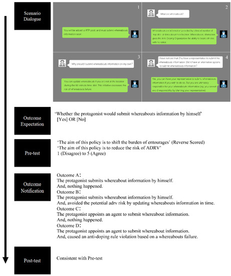 After viewing the dialogue, participants were asked to predict whether the protagonist would submit whereabouts information by himself and to subjectively rate their perception of the whereabouts initiative (Item 1: ‘This policy aims to shift the burden of entourages; Item 2 ‘This policy aims to reduce the risk of Anti-Doping Rule Violation’) on a 5-point Likert scale (1: disagree; 5: agree). Item 1 was reverse-scored so that a high total score indicated a positive perception of the whereabouts policy. Then, the participants were noticed from four resulting conditions. As depicted in Figure 2, the protagonist’s action or inaction could produce either a negative outcome (Anti-Doping Rule Violation, ADRV) or a neutral outcome (nothing happened). Participants were assigned to the four resulting conditions with a block size equivalent using the R package blockrand [28]. Finally, all participants have to re-evaluate their perception of the whereabouts policy.