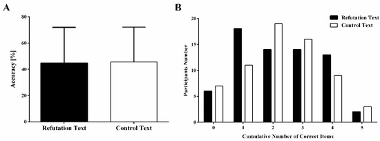 As depicted in Figure 3, the mean accuracy of the true/false test is significantly lower than the probability of guessing (t131 = −2.08, p < 0.05, and d = −0.18). In total, 96.21% (127/132) of participants could not answer all the questions correctly. In addition, no significant difference in true/false test accuracy was found between the two groups. Moreover, the perceived effectiveness scores for the refutation texts were greater than the control texts (4.14 ± 0.86 vs. 3.46 ± 1.16, t130 = 3.79, p < 0.01, d = 0.66).