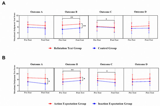 Situational judgement test score for each outcome. (A) The difference in situational judgement tests between pre-test and post-test for refutation texts and control group. (B) The difference in situational judgement tests between pre-test and post-test for action expectation and inaction expectation group. Data are mean ± SD. * = p < 0.05; ** = p < 0.01.