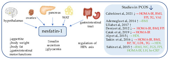 Similar studies have also been conducted on humans [25,38,48,49,50,51,52,53]. In most of them, PCOS population was characterized by decreased circulating nesfatin-1 concentration [25,49,50,51,52]; nevertheless, studies by Ademoglu, Sahin, and Ullah et al. showed the opposite, as serum nesfastin was increased [38,48,53]. Similar inconsistent data exist for type 2 diabetes mellitus (T2DM) [54,55]. In the studies by Deniz, Taskin, and Caltekin et al., negative correlations between nesfatin-1 levels and Body Mass Index (BMI) and Homeostatic Model Assessment-Insulin Resistance (HOMA-IR) have been observed [25,49,52].