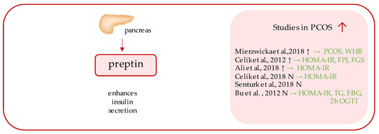 Over the years, several studies aimed at measuring fasting preptin serum concentrations in females with PCOS were undertaken; however, the results of which remain inconsistent, as significantly higher serum preptin concentrations have been detected in some studies [26,58,59], while other studies have undermined this relationship [60,61,62].