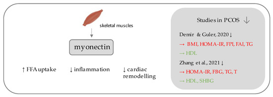 There have been two studies assessing the levels of myonectin in PCOS patients, to the best of our knowledge [27,75]. In the study by Demur and Guler, myonectin levels were significantly lower in PCOS subjects, when compared to their BMI-matched controls. Myonectin has exhibited inverse association with BMI, insulin resistance (measured using HOMA-IR, FPI), free androgen index (FAI), and triglycerides, while it showed a positive association with high-density lipoprotein cholesterol (HDL-C) [27]. Concordant results, in terms of myonectin concentration and the correlations were obtained by Zhang et al., in slightly larger groups (each containing 100 participants) [75]. The first aforementioned study also compared overweight/obese PCOS subjects (n = 40) to lean PCOS subjects (n = 32), and concluded that body mass excess may decrease myonectin concentration (6.34 ± 1.93 vs. 7.31 ± 1.90 ng/mL; p = 0.038) [27]. Similar observations have been made in the cohorts with obesity and T2DM, wherein serum myonectin was negatively correlated with HOMA-IR [76]. Importantly, the implementation of physical exercise, enhancement of insulin sensitivity, and body mass reduction may increase the myonectin serum levels [77]. The aforementioned studies remain promising, indicating that myonectin may be an important regulator of metabolism and that its concentration is decreased under conditions associated with insulin resistance and body mass excess, including PCOS.