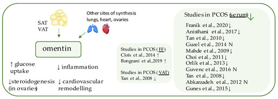 Role of omentin in the pathogenesis of insulin resistance and PCOS. List of the studies assessing nesfatin level in serum, follicular fluid (FF), and visceral adipose tissue (VAT) of the patients with PCOS. ↓/N indicates that concentration level of omentin was decreased/unchanged in PCOS individuals (p < 0.05).
