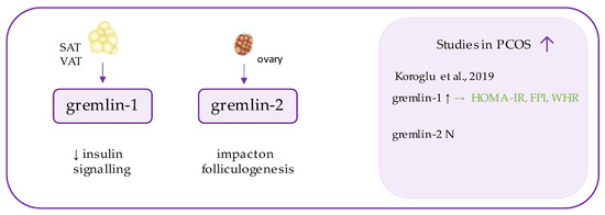 There has only been one study assessing the serum concentration of gremlin in PCOS patients, to the best of our knowledge [29]. It presented significantly increased serum gremlin levels in the affected individuals, in comparison to the controls, and positive correlations with various markers of insulin resistance, such as insulin levels, HOMA-IR and waist-to-hip ratio (WHR) were observed. These observations related only to gremlin-1, while no significant results were provided for gremlin-2 [29]. This is consistent with the results presented by Hedjazifar et al., who focused on other conditions associated with insulin resistance [104]. We may conclude that deviations of circulating gremlin-1 in PCOS may reflect the metabolic disturbances in affected individuals. This places gremlin-1 as a potential biomarker of insulin resistance, and the aspect regarding the involvement of both gremlins in ovarian dysfunction remains promising in terms of future studies on PCOS pathogenesis.
