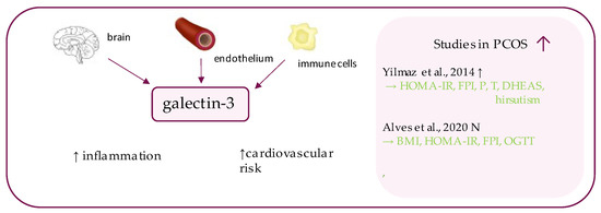 In the studies that divided PCOS patients into sub-groups, depending on whether or not individuals exhibited features associated with metabolic syndrome, significantly higher Gal-3 levels have been observed in subjects with metabolic syndrome [129]. Additionally, in this study, positive correlations were discovered between galectin and systolic and diastolic blood pressure, as well as with triglyceride levels [129]. Gal-3 level seem to be not only a possible marker of PCOS, but may also enable the identification patients at higher risk of developing metabolic or cardiovascular complications [129].
