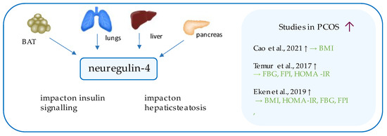 Although numerous animal studies considering neuregulin-4 (NRG4) have been performed, there are limited data in humans. NRG4 is known to serve as a one of the factors improving insulin sensitivity [135], protecting the liver from fatty liver disease (FLD) [131] and its low circulating level may potentially serve as a risk factor for gestational diabetes mellitus [136]; however, the NRG4–PCOS relationship is poorly represented in the literature.