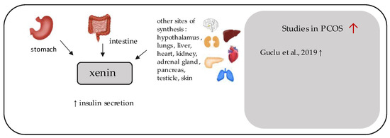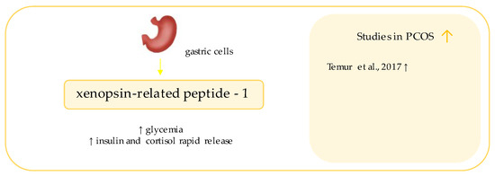 Xenopsin-related peptide-1 had not gathered any attention as a subject of the gynecological endocrinology research until 2017, when Temur et al. considered XP-1 as a potential biomarker of insulin resistance in PCOS subjects [32]. In this study, XP-1 was found to be significantly higher in PCOS patients than in healthy controls [32]. Values of fasting serum insulin, C-reactive protein (CRP), and indicators of insulin resistance were higher in the affected individuals [32]. Interestingly, no correlations between XP-1 and lipid profile, insulin resistance indicators, or hormones were observed in the study group; however, XP-1 levels were significantly correlated with age, insulin, and HOMA-IR in the controls [32].