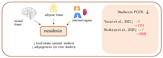 The study by Bozkaya et al. comprised the first attempt to investigate a putative link between PCOS diagnosis and serum neudesin concentration [168]. The authors revealed its lowered level in PCOS patients, and an inverse association between neudesin levels and PCOS risk was determined [168]. Moreover, while progesterone levels are known to be decreased in the course of PCOS [173], in the study by Bozkaya et al., its level did not significantly differ between the study and control groups, and a positive correlation between neudesin and progesterone was noted in the affected individuals [168]. An insignificant difference in the neudesin level was observed between PCOS group with and without insulin resistance [168]. Although higher insulin, HOMA-IR, FPG, and FPI values were noted in PCOS subjects, no link was proved in the statistical analysis between neudesin and insulin resistance-related parameters [168].