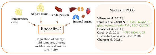 Role of lipocalin-2 in the pathogenesis of insulin resistance and PCOS. List of the studies assessing lipocalin-2 in serum of the patients with PCOS. ↑/↓/N indicates whether concentration level of lipocalin-2 was increased/decreased/unchanged in PCOS individuals (p < 0.05); → (green)—indicates positive correlation between serum lipocalin-2 and particular indicators; BMI—body mass index; HOMA-IR—Homeostatic Model Assessment—Insulin Resistance; FPI—fasting plasma insulin; FBG—fasting blood glucose; QUICKI—quantitative insulin sensitivity check index.