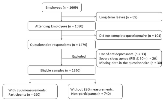 A cross-sectional study was conducted as part of the Night in Japan Home Sleep Monitoring (NinJaSleep) sleep and mental health epidemiological study [15]. Participants included government employees of Koka City, which is a rural city in the Shiga Prefecture of Japan. Among the 1669 employees, 89 employees were excluded because of long-term leaves (more than 30 days), including sick, maternity, and childcare leaves. A total of 1580 questionnaires were distributed on 3 September 2018. Of these, 1479 employees returned the questionnaire (93.6%: 1479/1580). Exclusion criteria were usage of antidepressants (n = 33), having severe sleep apnoea with a respiratory event index (REI) ≥30 (n = 26), and missing items in the questionnaire (n = 30). Thus, 1390 participants were eligible for analysis. Of these, 650 underwent sleep monitoring with 1-Ch EEG at home (participants) and the others did not perform home EEG recordings (non-participants, n = 740) (Figure 1).
