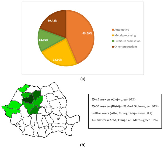 The geographical positioning of the companies that answered the questionnaire around Transylvania includes counties such as Cluj, Bistrița-Năsăud, Sălaj, Sibiu, and Alba, which contained some of the largest economic centers, with limited numbers from other counties in the region, such as Satu Mare, Arad, and Timiș (see Figure 1b). In sum, the analysis of this survey is clearly pinpointed in time and space, allowing for a better snapshot to be obtained.