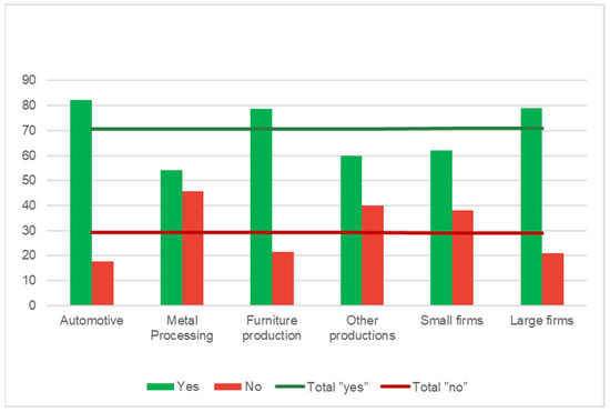 Regarding the selection process of stakeholders to whom they collaborate with, 71% of respondents take into account the attitude towards the environment of the interested parties. In Figure 3, the average of the positive answers is marked with a green line and the average of the “no” answers is marked with a red line. Additionally, in Figure 3, the answers are presented for each sector of the responding firms. The green bars represent the answers of the companies that take into account the attitude of stakeholders about the environment and the red bars represent the companies that do not take this into account.