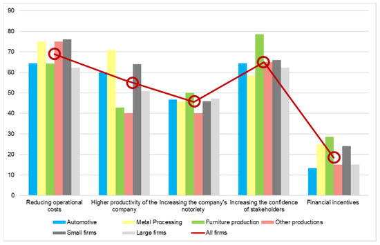 In the next area of the questionnaire, they were asked about the benefits they aim for when implementing the recommended actions for protecting the environment. As it can be seen in Figure 4, the red line marks the trend of all the companies answers and the bars represent the answers divided by the field of each company as well as the size of the companies, split into small and large firms. All the measures on the graph are expressed in percentages. So, as it can be seen, the three main benefits targeted by the respondents are reducing operational costs, increasing the confidence of stakeholders in the company’s products, and higher productivity of the company. All of these benefits are targeted by more than 55% of all the manufacturing firms which answered the questionnaire. Besides, financial incentives are of less benefit, as targeted by all the companies. The targeted benefits by automotive firms, above the average, are higher productivity of the company and increasing the company notoriety, while the others were slightly below the average. In Figure 4, the automotive sector is represented by blue bars. For metal processing, the yellow bars, and the benefits targeted by them above the average, represent the reducing operational costs, higher productivity of the company, and financial incentives. As seen in the figure, the difference is more significant than in the automotive sector, where the differences are not easy to notice, mostly because they are part of large international conglomerates with well-defined environmental policies. For the companies from furniture production sector, increasing the confidence of the stakeholders, financial incentives, and increasing the company’s notoriety are the benefits targeted above the average. Additionally, it can be seen in the figure that, for this sector, the confidence of stakeholders is very important. The furniture production firms are marked with green bars. The other production sector is close to the average, which is to be expected in a mixed category, with only the productivity of the company differing, which is highly below the target.