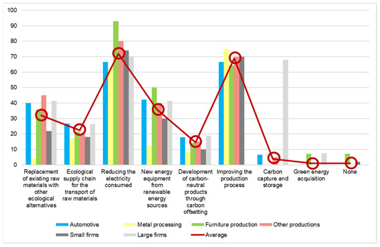The most implemented measures in order to reduce carbon footprint include reducing the electricity consumed by using ecological lightning fixtures, investing in state-of-the-art technological equipment, and improving the production process by ensuring increased efficiency and eliminating downtimes. The percentage of the companies which implement these measures is ca. 70%. As it can be seen in Figure 6, the red line shows the average expressed in percentages of the measures implemented by the studied companies. Furthermore, there are only nine companies which do not take any measure to reduce the negative impact on the environment, which is less than 1% of the total. In second and third place, the survey revealed process improvement, which is analyzed in detail further in this section, and raw material replacement, respectively. This is line with the current findings at the European level that have been presented in the study [28] of material supply chains. Since the companies come from different parts of the value creation process, we consider that the market is already aware, perhaps in a subconscious form, of the potential of carbon emission reduction identified by the mentioned study. Further stimulation and support from the public sector could contribute to transforming this potential into actual savings, and these measures should take into account the conclusions of [29] about pricing practices being more relevant than technology implementation.