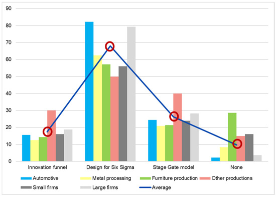 The product development and design stages are critical for achieving low-carbon performances as mentioned by [30] in their study about the sand-casting process. In order to investigate this feature of LCE manufacturers and to find out which is the most frequently used technique in developing new products, a question with multiple choices was used with the following choices: stage gate model, design for six sigma, and innovation funnel. The stage gate model is a technique that has the purpose to transform the development process into sequential steps, and validate each of them, before proceeding further, from the idea of the new product to its launch on the market [31]. Design for six sigma is a tool for implementing a highly disciplined customer-centric methodical way for the design and development of products or services [32]. An innovation funnel is a tool used to transform an idea from the beginning of the creation process into reality by eliminating nonviable contributions along the way. The graphic form of the tool is a converging funnel which starts with the collection of all the inputs in order to investigate the feasible ideas, selecting the best of them and developing them to the point to deliver the final product [33]. In our study, a determination of CO2 reduction was not targeted, as was the case of [30], but the general list of development algorithms and tools can support companies in making their own assessments in terms of the effectiveness of employing these approaches to their own specific sub-sector of manufacturing.