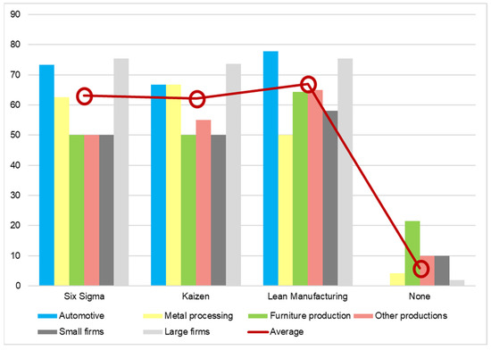 In order to find out which is the most frequently used method for improving the processes, the questionnaire applied a question with multiple choices, such as lean manufacturing, Kaizen, and Six Sigma. These are well-known approaches, applied on a large scale in production companies all over the world (see [34] for details), and the Romanian companies answering the questionnaire were also familiar with them.
